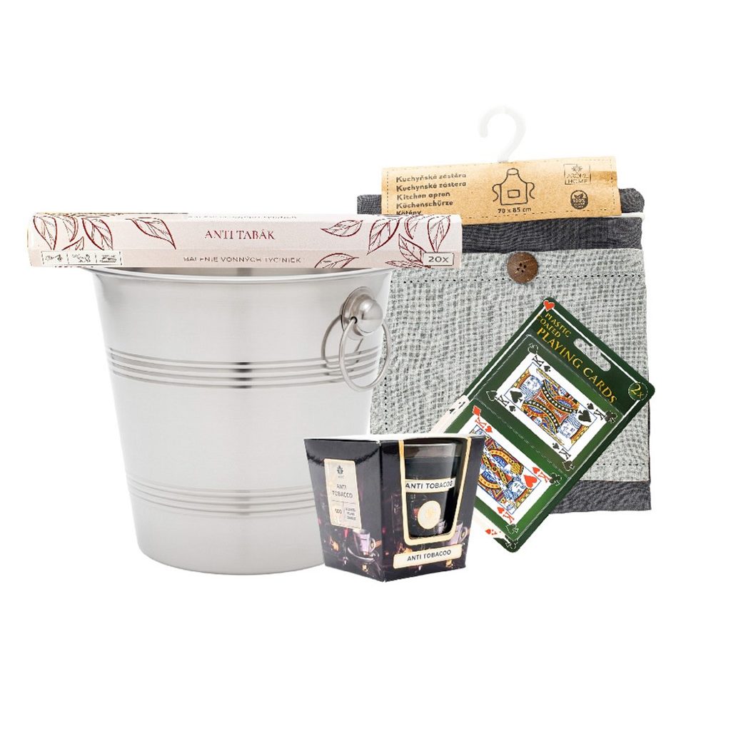 Dárkový set Stylový večer - chladič na víno, zástěra, karty, svíčka a vonné tyčinky