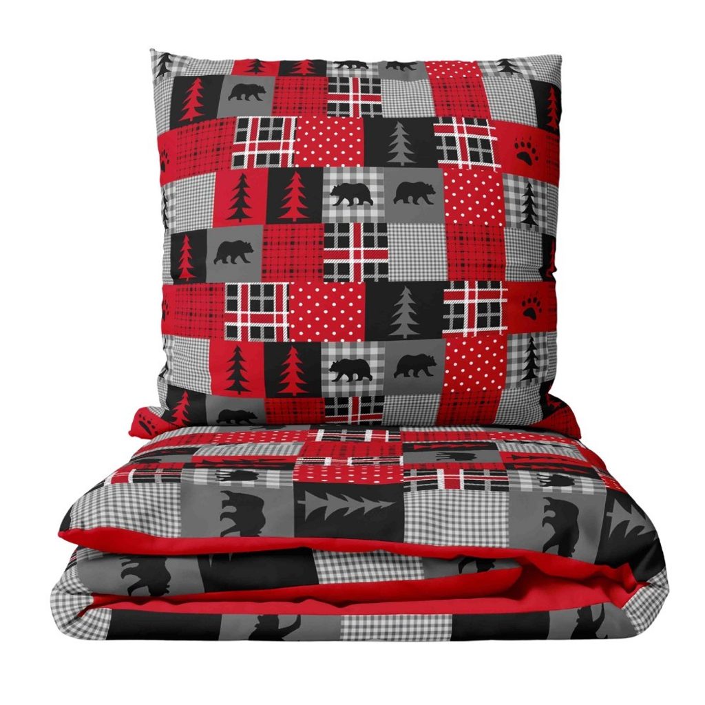 Atraktivní moderní káro v tmavší červené, černé, šedé a bílé barvě s medvědími tlapkami, medvědy, stromy i puntíky připomíná patchwork. Bude stylovým doplňkem ložnice a vnese nádech rustikálního interiéru.
