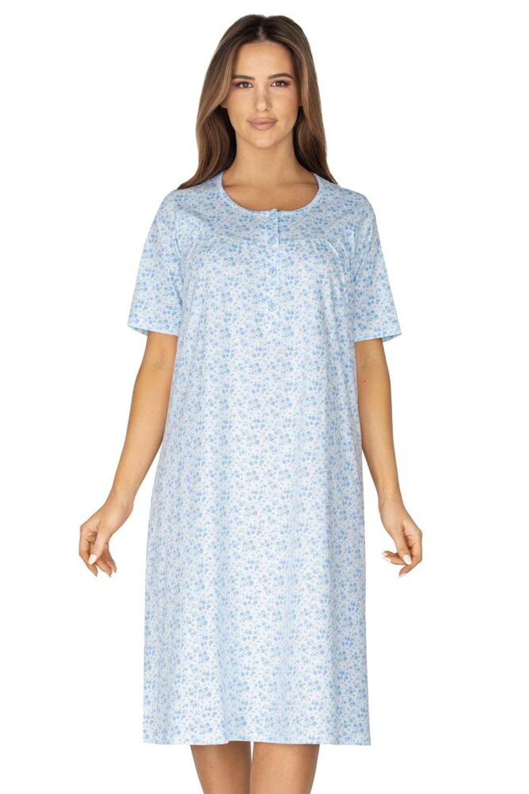 Modrá noční košilka má krásný drobný vzor s květinami, je dlouhá a má praktický rozepínací výstřih.