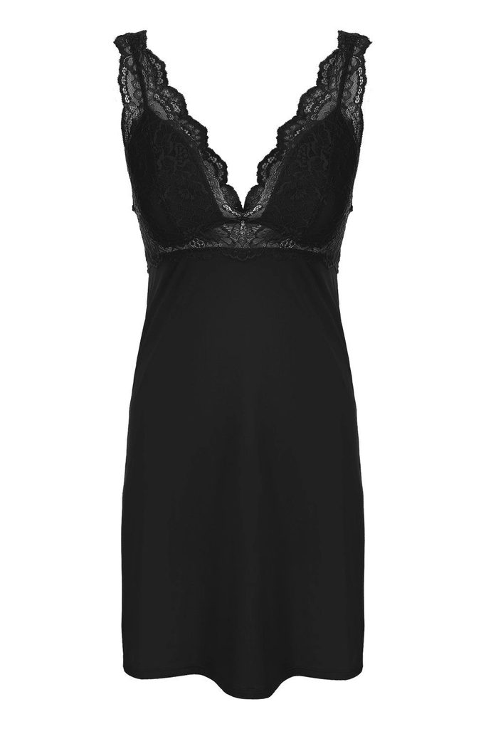 Noční košile 36120 Lilly HENDERSON - černá barva - z vysoce kvalitního materiálu - široká krajková ramínka - výstřih a pod prsy ozdobená krajkou s květinovým motivem - košíčky bez kostic a jsou podšité lehce vyztuženou pěnou - mezi košíčky bižuterie