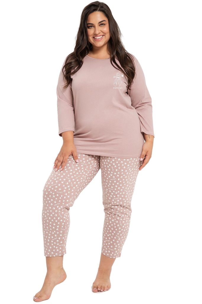 Dámské pyžamo 3006 Gabrielle Taro - vyrobené z vysoce kvalitní a měkké bavlny - béžové tričko s dlouhými rukávy - ozdobené na přední straně potiskem - vzorované kalhoty