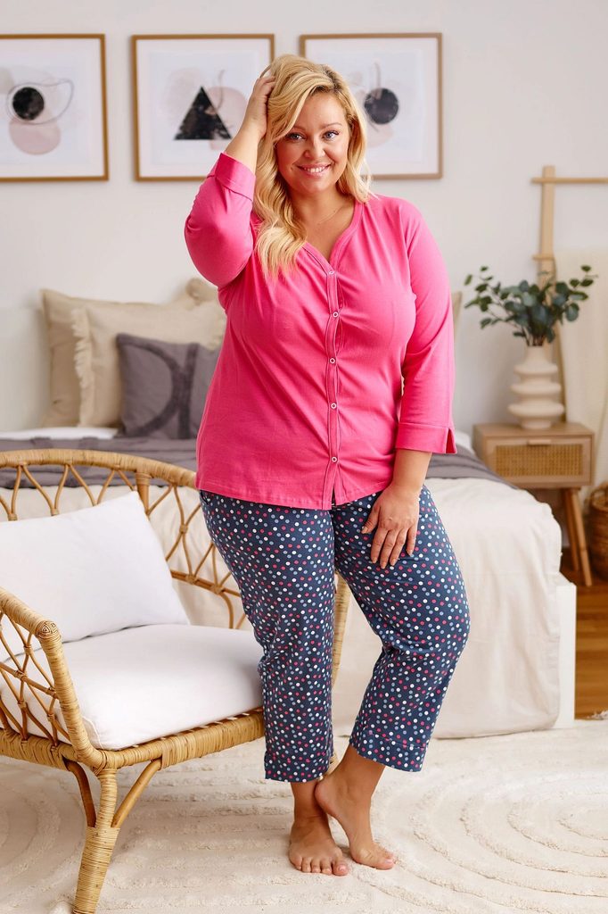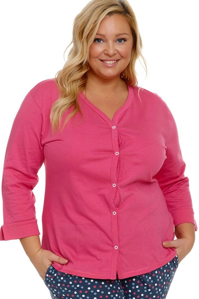 Dámské pyžamo 4566 Doctor Nap - vyrobené z velmi kvalitní a příjemné bavlny - růžová košile na zapínání a s tříčtvrtečními rukávy - dlouhé vzorované kalhoty s kapsami - certifikát OEKO-TEX Standard 100