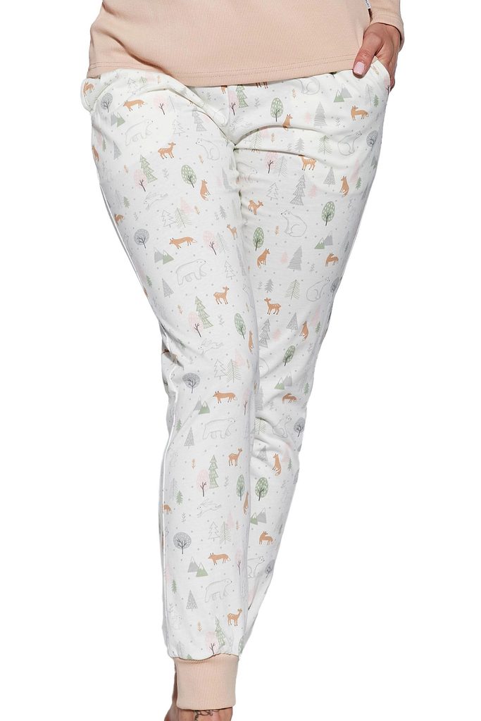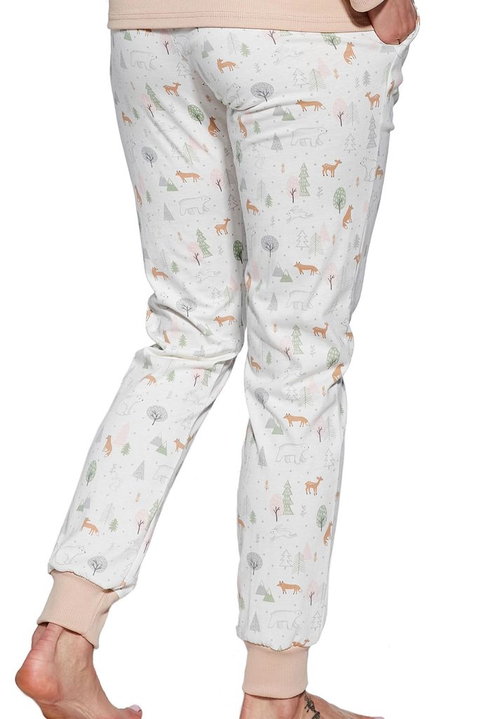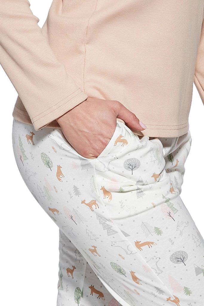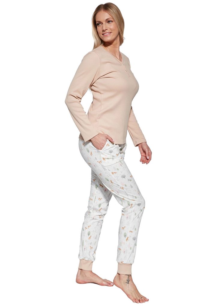 Dámské pyžamo 723/351 Emy CORNETTE - bavlněný materiál je poddajný a jemný na dotek - béžové tričko s dlouhými rukávy - zapínání na patentky - dlouhé vzorované kalhoty