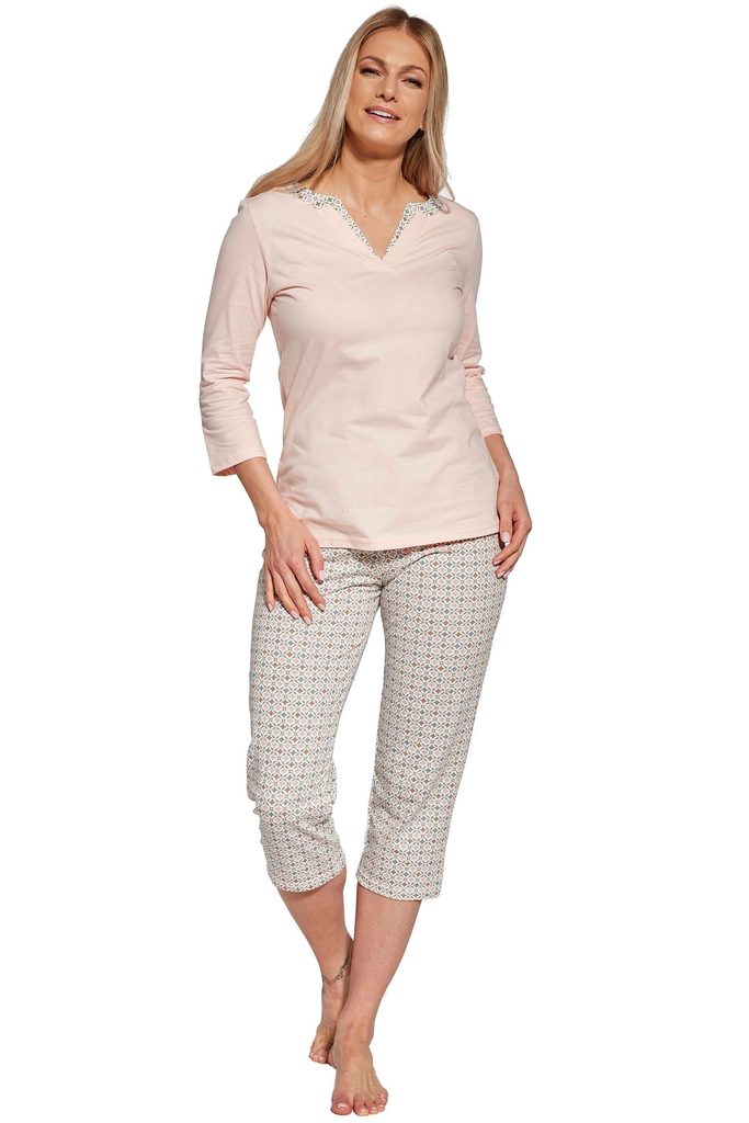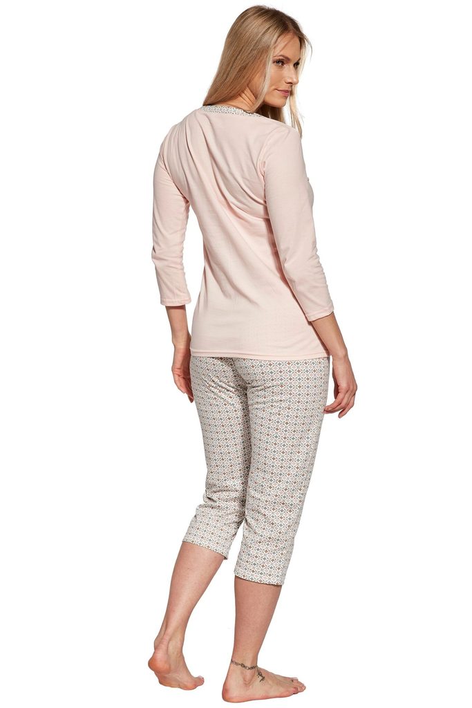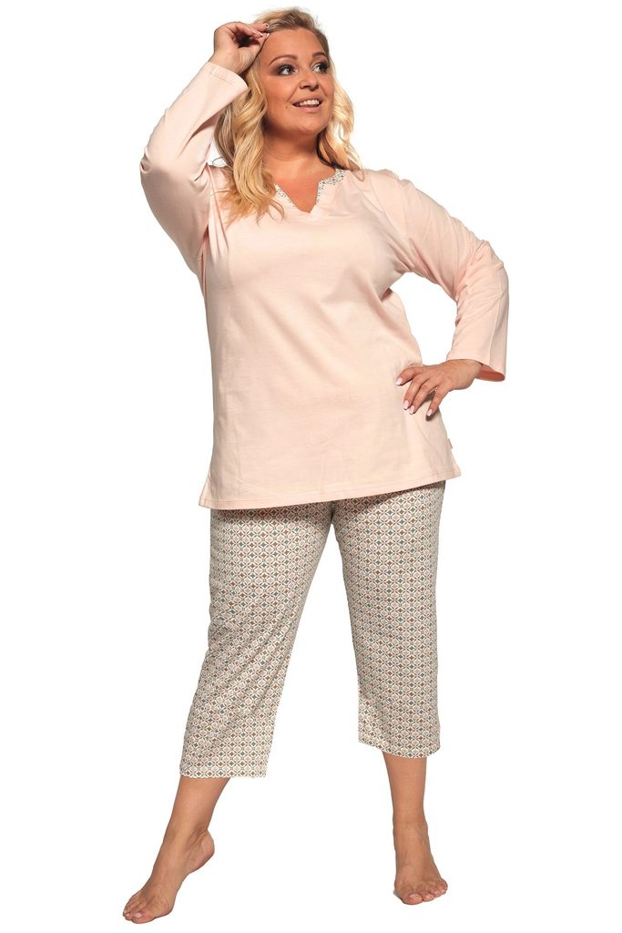 Dámské pyžamo 766/358 Cindy plus CORNETTE - z vysoce kvalitní a na dotyk příjemné bavlny - lososové tričko s tříčtvrtečními rukávy - vzorované kalhoty