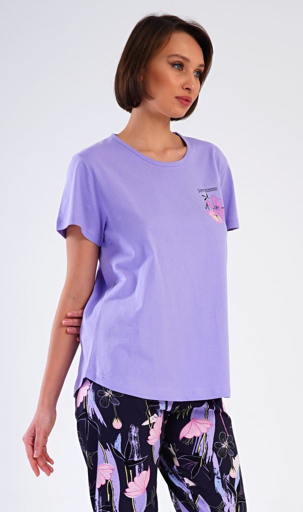 Dámské bavlněné kapri pyžamo Flowers. Dámské pyžamo se skládá z trička s krátkým rukávem a tříčtvrtečních kalhot. Tričko s kulatým výstřihem má na hrudi obrázek květu. Tento motiv se opakuje i na kalhotách, které mají v pase gumu a šňůrku na stažení, jsou bez kapes. Použitý bavlněný materiál je příjemný a poddajný na dotek.