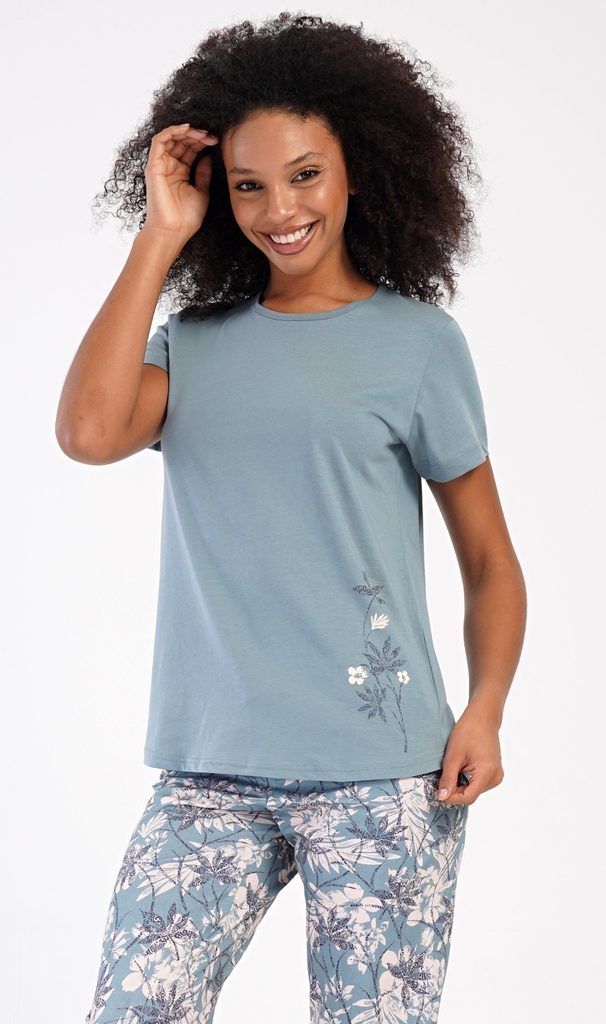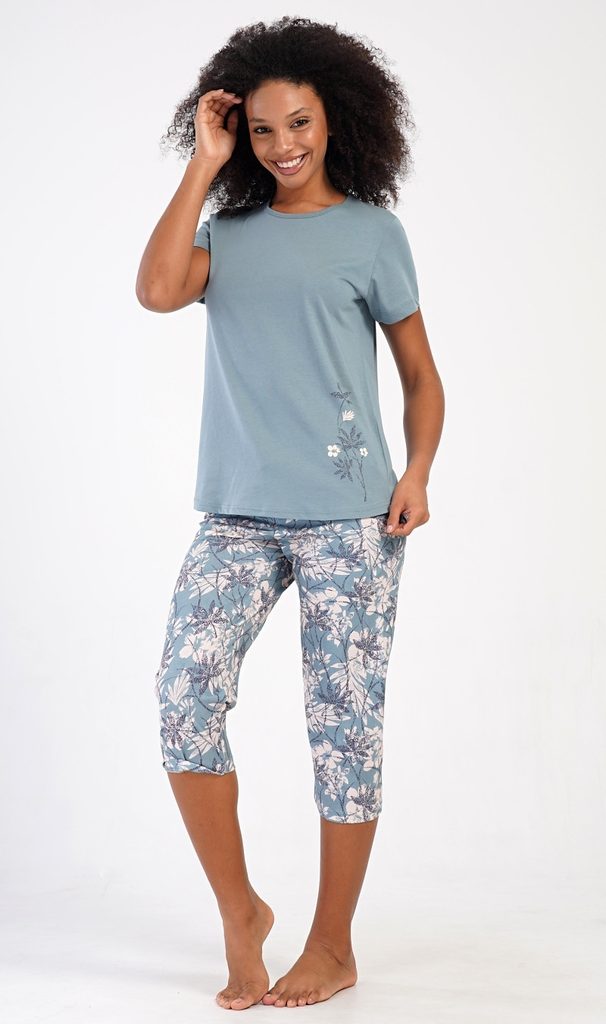 Dámské bavlněné kapri pyžamo Francesca. Dámské pyžamo se skládá z trička s krátkým rukávem a tříčtvrtečních kalhot. Tričko s kulatým výstřihem zdobí obrázek květin. Tento motiv se opakuje i na kalhotách, které mají v pase gumu a šňůrku na stažení, jsou bez kapes. Použitý bavlněný materiál je příjemný a poddajný na dotek.