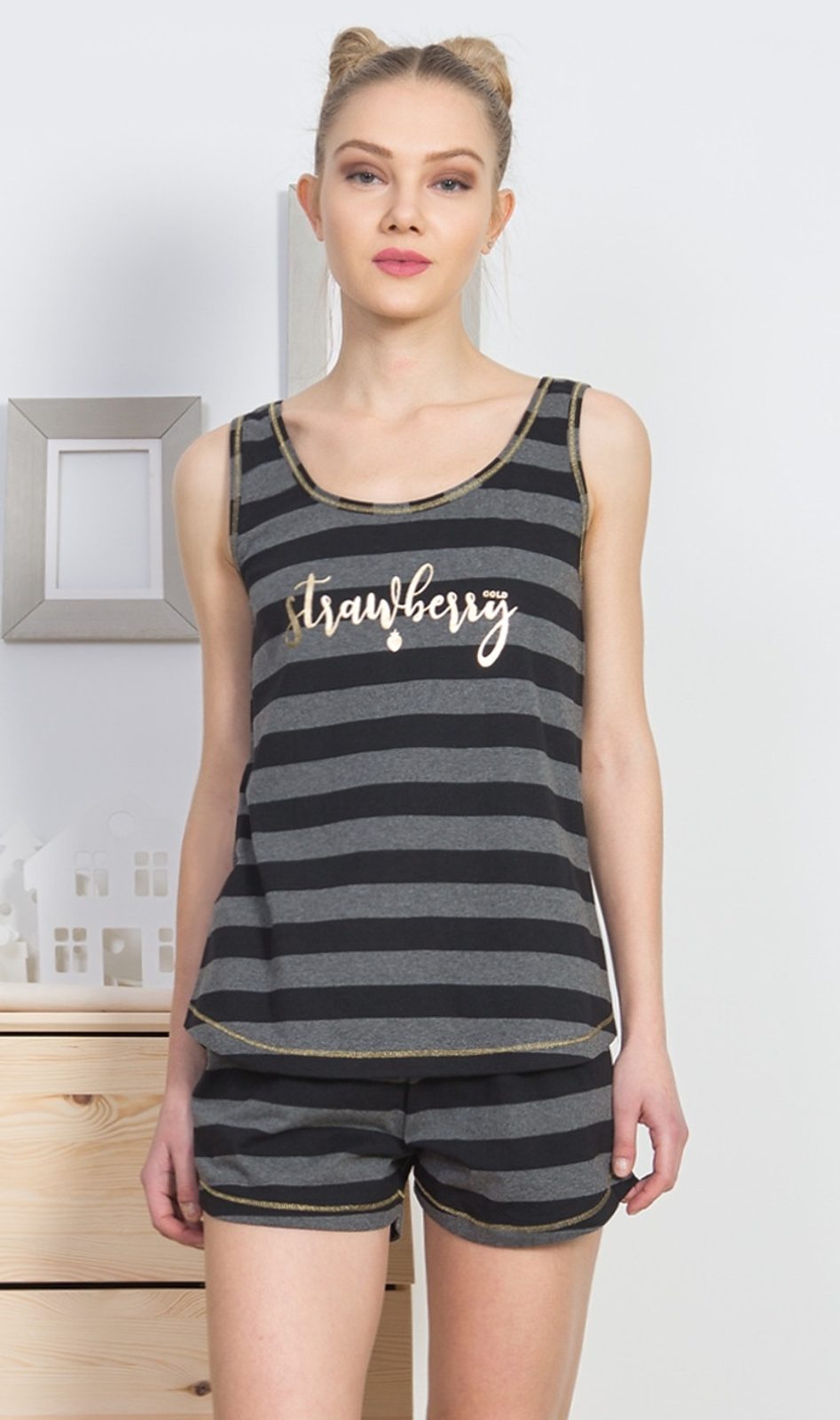 Dámské pyžamo šortky na ramínka Strawberry. Pyžamo se skládá z tílka se širokými ramínky a krátkých šortek. Tílko i šortky jsou provedeny v oblíbeném pruhovaném stylu, na tílku je pak zlatý nápis Strawberry a malý obrázek jahody. Celé pyžamo je zlatě olemováno. Použitý materiál je jemný a poddajný na dotek. Pyžamo je vhodné i na denní nošení.