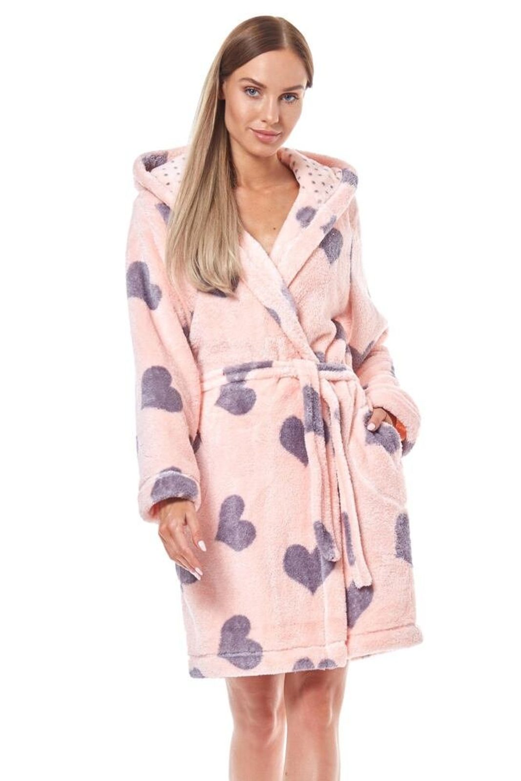 Příjemně měkoučký huňatý župan s kapucí v lososové barvě s fialovými srdíčky.