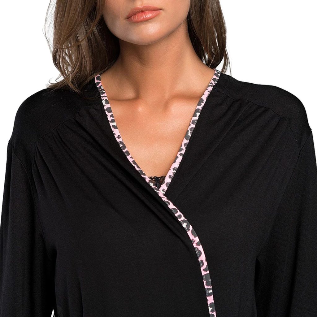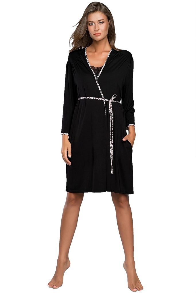 Dámský župan Eila ITALIAN FASHION - černá barva - je vyrobený z velmi kvalitního materiálu - s dlouhými rukávy - zavazování na pásek v leopardím vzoru - na bocích jsou kapsy - délka nad kolena