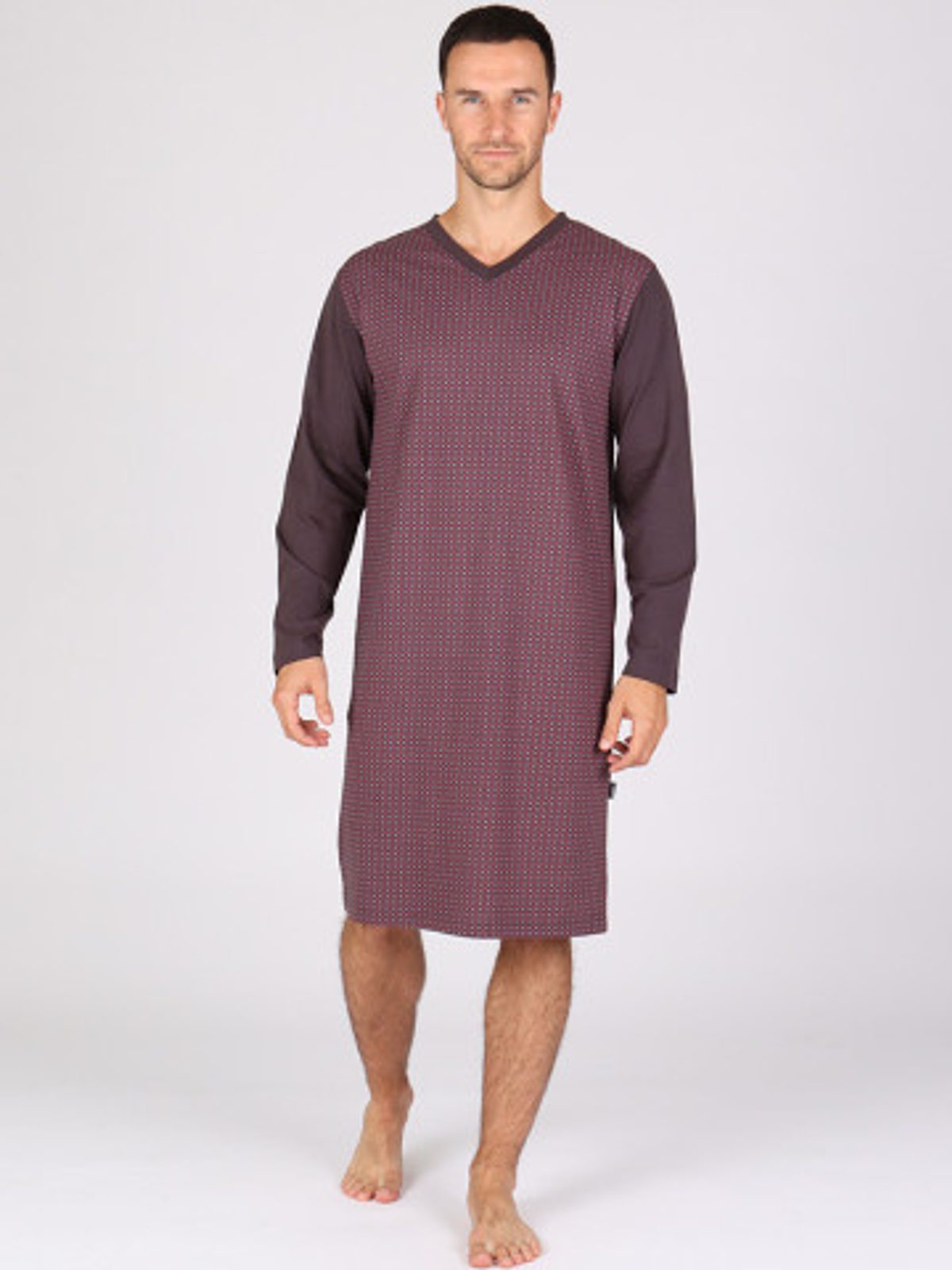 •    pánská noční košile je volnějšího střihu s délkou ke kolenům