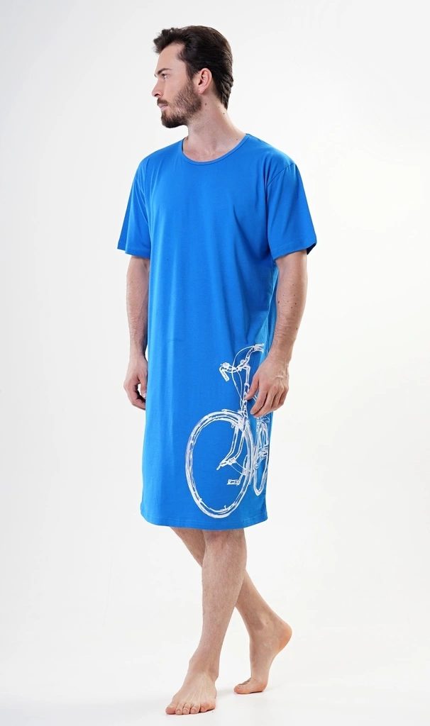 Pánská bavlněná noční košile s krátkým rukávem Bicykl. Noční košili zdobí velký potisk jízdního kola. Bavlněný materiál je poddajný a jemný na dotek.