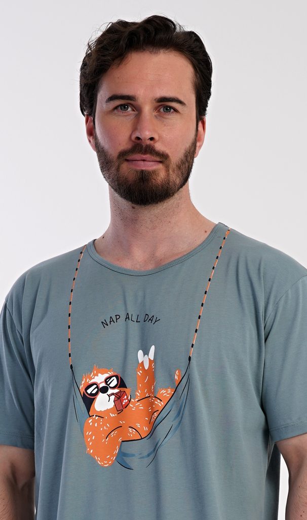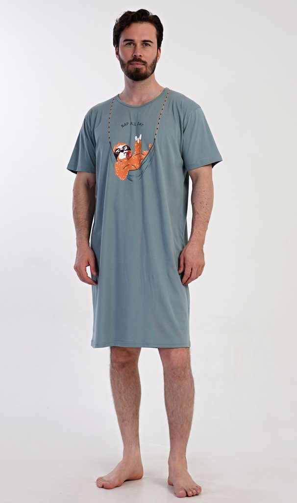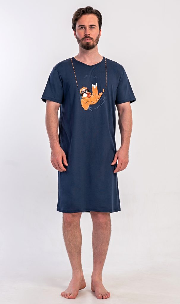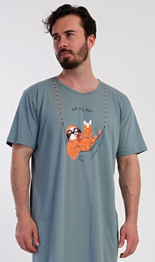 Pánská bavlněná noční košile s krátkým rukávem Pohodář. Jednobarevná pánská noční košile s kulatým výstřihem a délkou po kolena má na hrudi obrázek lenochoda v houpací síti. Použitý materiál s obsahem bavlny 100% je příjemný a poddajný na dotek.